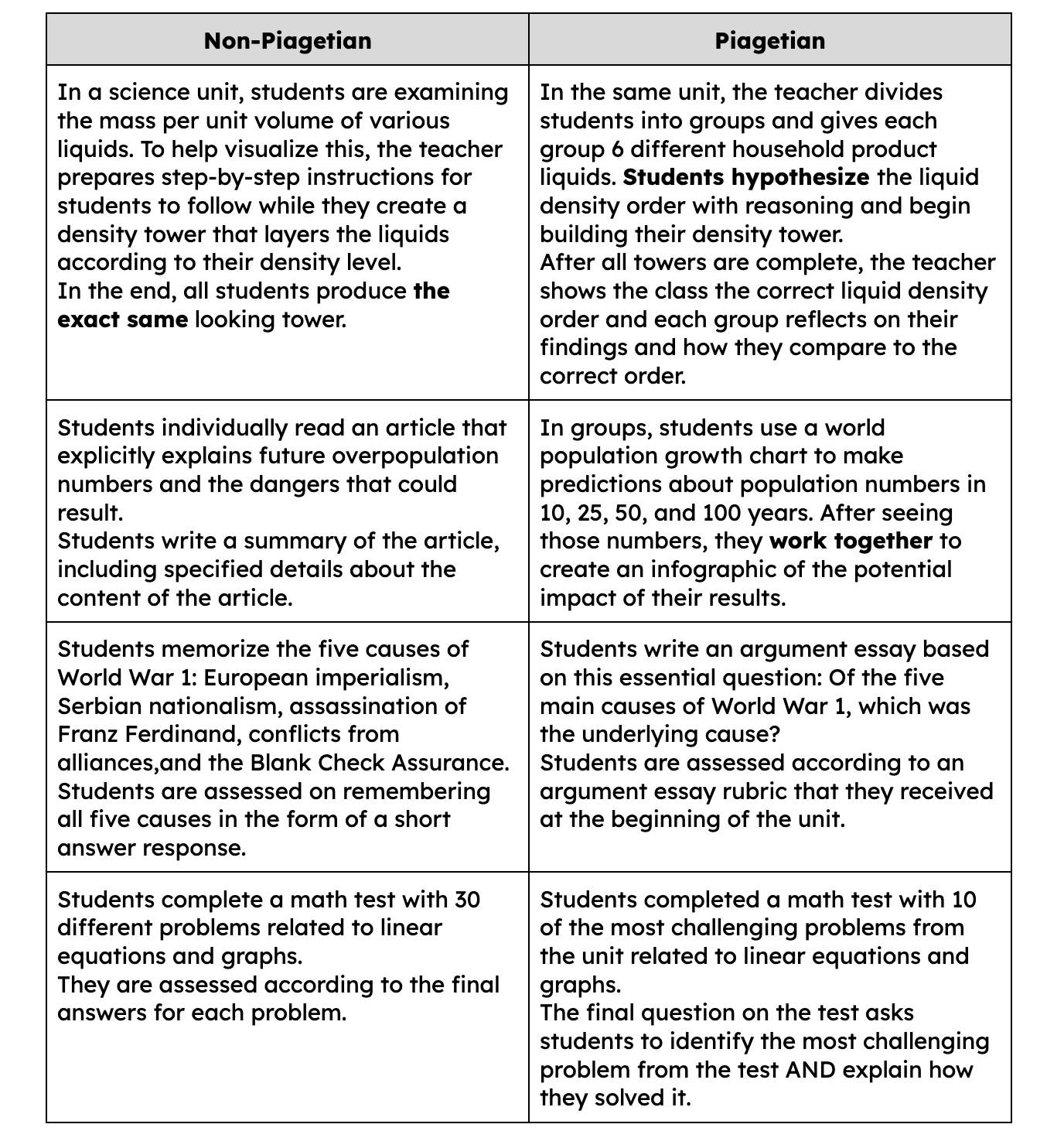 The more neglected aspect in education (and the power of Piagetian programs) happens at the final level of Piaget’s cognitive development stages. Starting around 5th grade (yes, 5th grade)and continuing through high school, students should be given the tools, resources, and tasks to practice abstract reasoning and challenged to complete a variety of high-level cognitive tasks:
